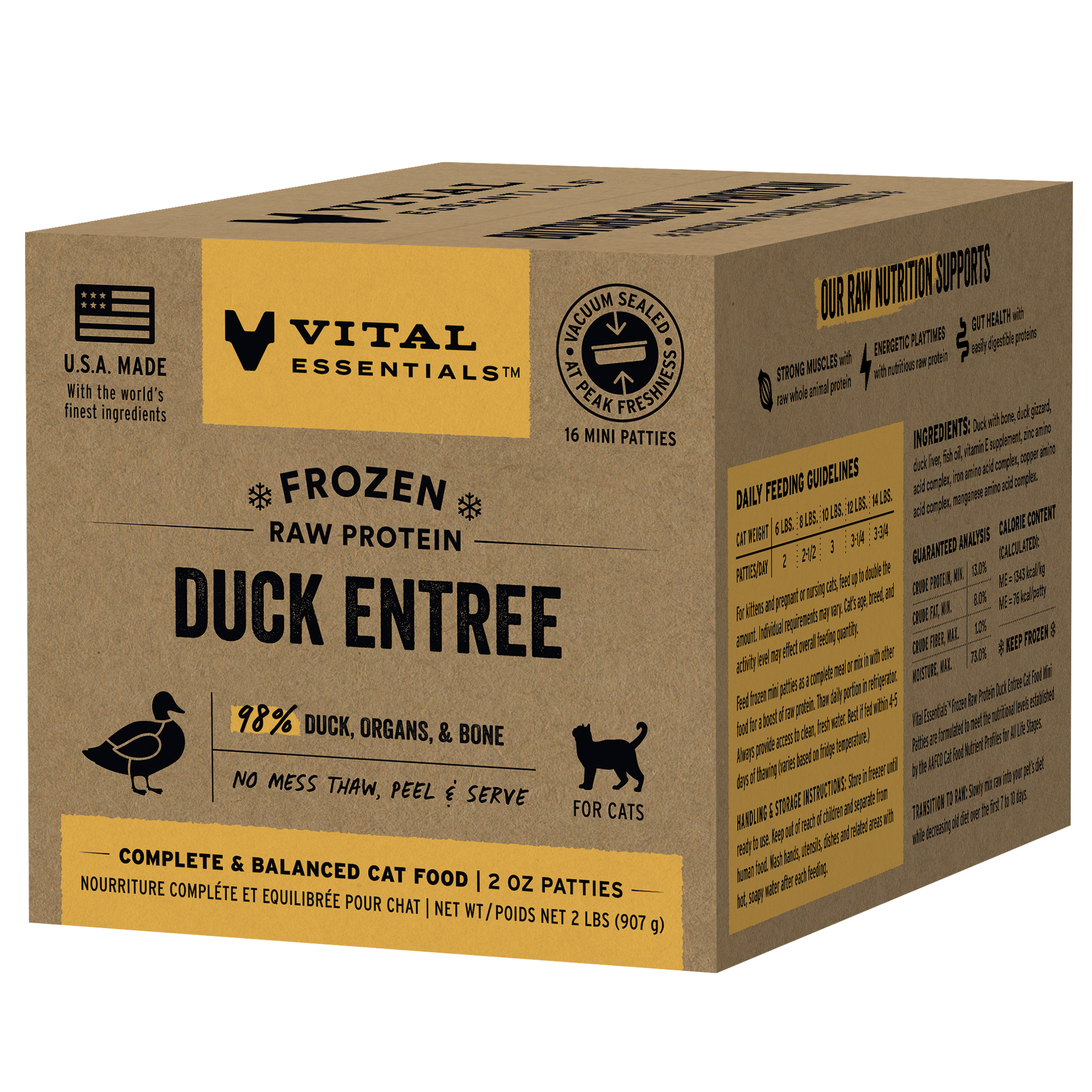 Superior raw protein provides superior benefits for cats. Our frozen duck mini patties deliver rich Butcher Cut Protein from 98% whole animal duck, organs, and bone in perfect 2 oz portions. Serve it as a whole meal or mix-in with other foods to provide a boost of moisture and raw protein to support your cat's vitality.
