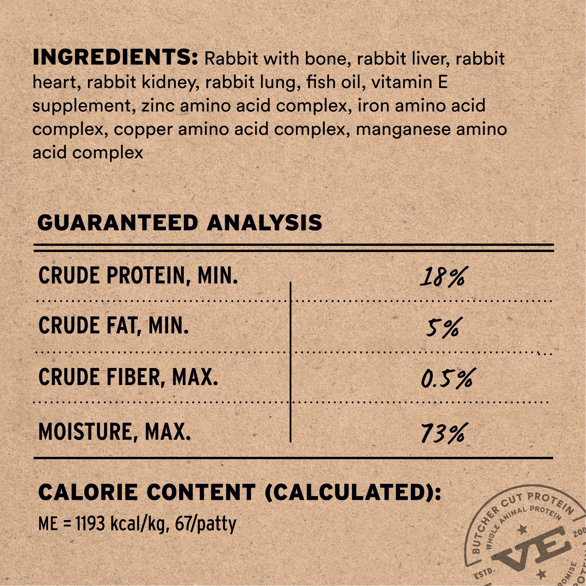 Superior raw protein provides superior benefits for cats. Our frozen rabbit mini patties deliver novel Butcher Cut Protein from 98% whole animal rabbit, organs, and bone. Perfect for cats with sensitivities. Serve it as a whole meal or mix-in with other foods to provide a boost of moisture and raw protein to support your cat's vitality.