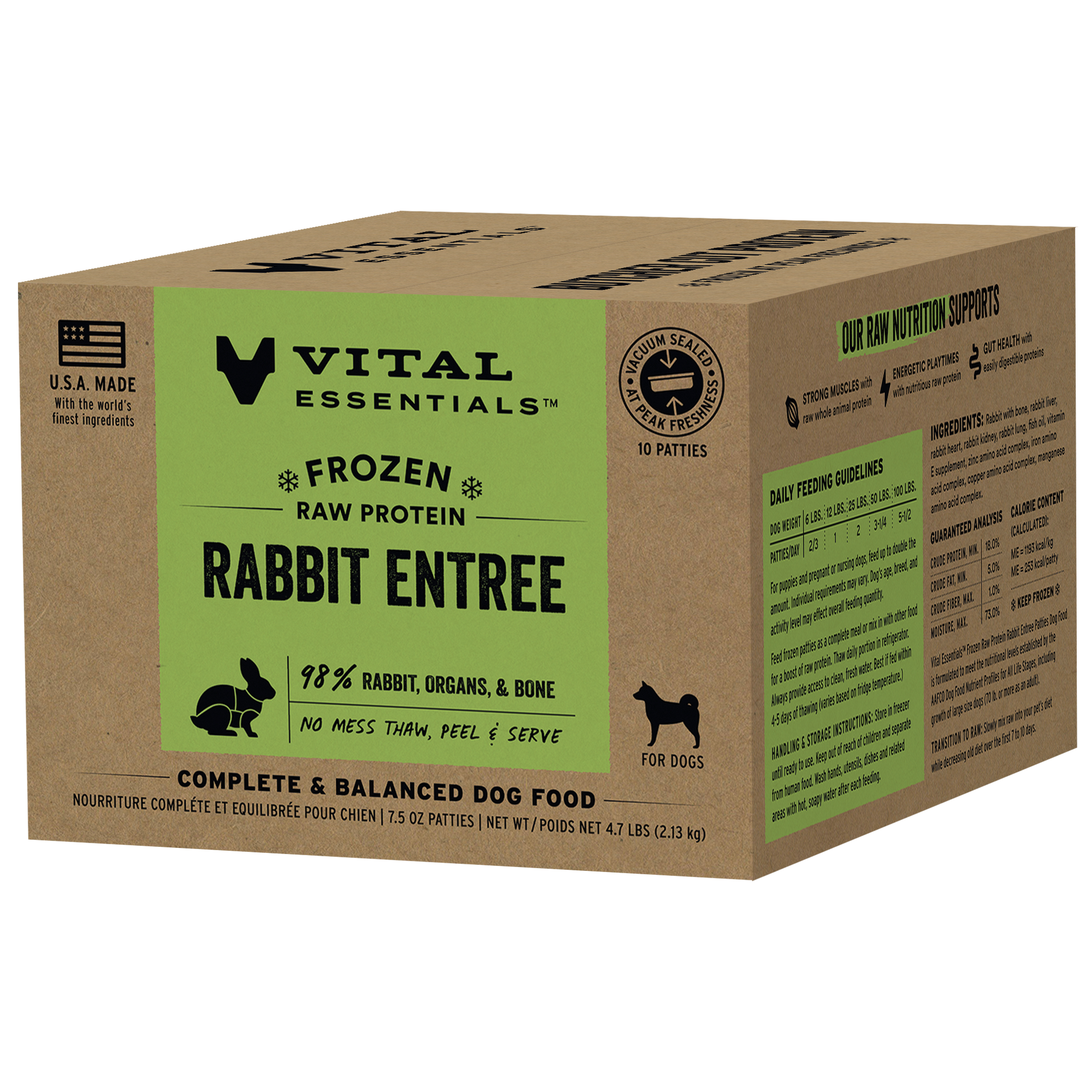 Superior raw protein provides superior benefits. Our frozen raw rabbit patties deliver Butcher Cut Protein from 98% whole animal duck, rabbit, and bone. Simply thaw and serve—no mixing or cooking required for complete raw nutrition. Serve it as a whole meal or mix-in with other foods to provide a boost of moisture and raw protein to support your dog's vitality.