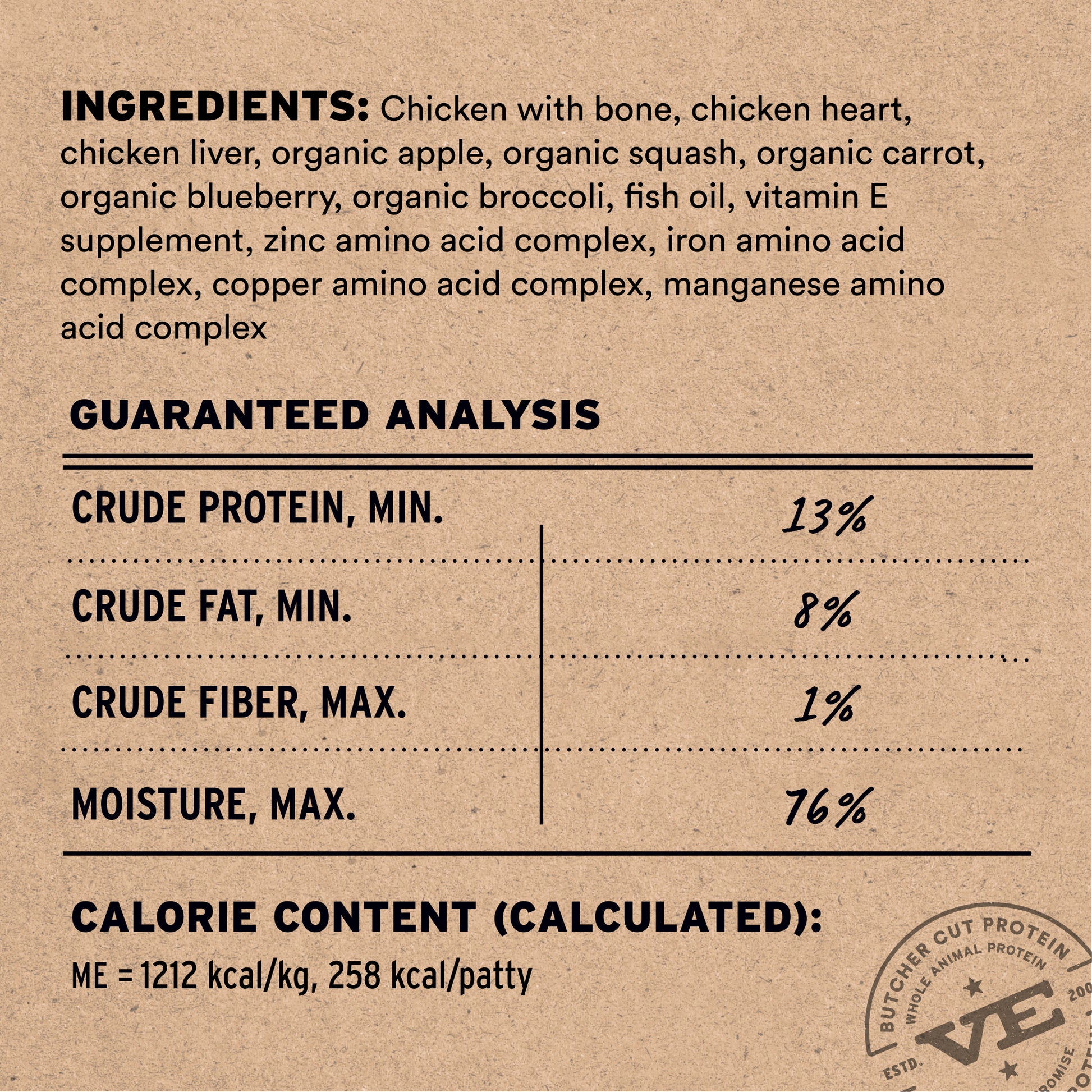Superior raw protein meets superior nutrition. RAW FUSION blends premium Butcher Cut Protein with nutrient-packed organic fruits and vegetables. 90% whole animal chicken + 10% organic produce for complete, balanced raw nutrition. Serve it as a whole meal or mix-in with other foods to provide a boost of moisture and raw protein to support your dog's vitality.